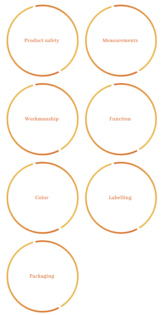 检验服务 - 我们会根据您的规格对产品进行仔细检查,以确保其符合您的质量要求和期望。 01 在线检测 质量关乎产品如何符合设计和规格 在线检查是在生产线现场进行的,通常是在前几件成品出线时,以便在早期阶段发现潜在的问题。 将对所选样品的所有适用参数进行评估,包括材料、尺寸、外观和监管要求。 02 最终检查 在发货之前,我们会根据您的规格对最终产品进行仔细检查。 最终检验对于确保成品符合您的预期质量水平至关重要。 ASTRA可以在您的工厂现场提供最终的AQL检查。 此外,我们在检验中心的设置和管理方面拥有丰富的知识和最新的专业知识。 最终随机检验(FRI)或装运前检验(PSI)是现场检查,用于监测生产是否符合规格。 根据定义的可接受质量水平 (AQL) 统计方法和您的要求,我们将根据以下标准从您的订单中随机选择样本进行全面检查: 03。 阿斯特拉质量控制检查员 高素质的检验人员 具有扎实的产品背景和相应的质量要求知识 至少有五年的质量检验经验 不断接受有关最新技能、知识和要求的培训 由主管持续监督,并由高级管理层定期评估 如果您有兴趣进一步了解我们的服务,请联系我们。 找到我们